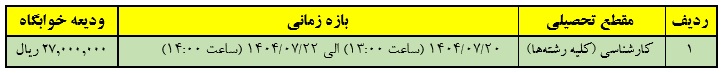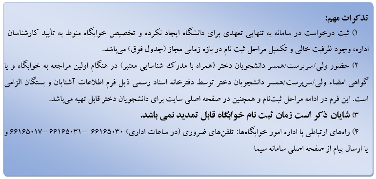 شایان ذکر است جدول زمانی اسکان در خوابگاه، در پایان ثبتنام، از طریق سامانه به اطلاع خواهد رسید.
