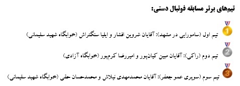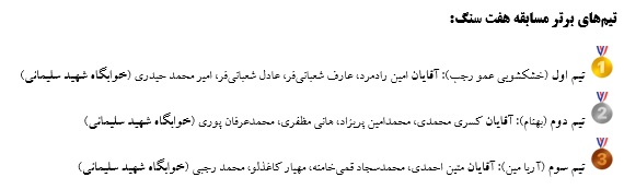اولین شب هفتمین جشنواره بازیهای بومی و محلی در تاریخ 1404/08/11 در خوابگاه پسران شهید سلیمانی با شرکت 84 نفر در رشته فوتبال دستی در قالب 42 تیم 2 نفره و 44 نفر در رشته هفت سنگ در قالب 11 تیم 4 نفره برگزار و به تیمهای اول تا سوم هر مسابقه حکم قهرمانی و کارت هدیه اهدا شد.
