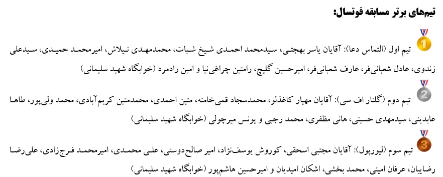 مسابقات فوتسال خوابگاههای پسران منطقه دو از تاریخ 1404/09/20 الی 1404/10/09 در دو مرحله مقدماتی و نهایی در خوابگاه پسران شهید سلیمانی با شرکت 120 نفر در قالب 12 تیم 10 نفره برگزار گردید.